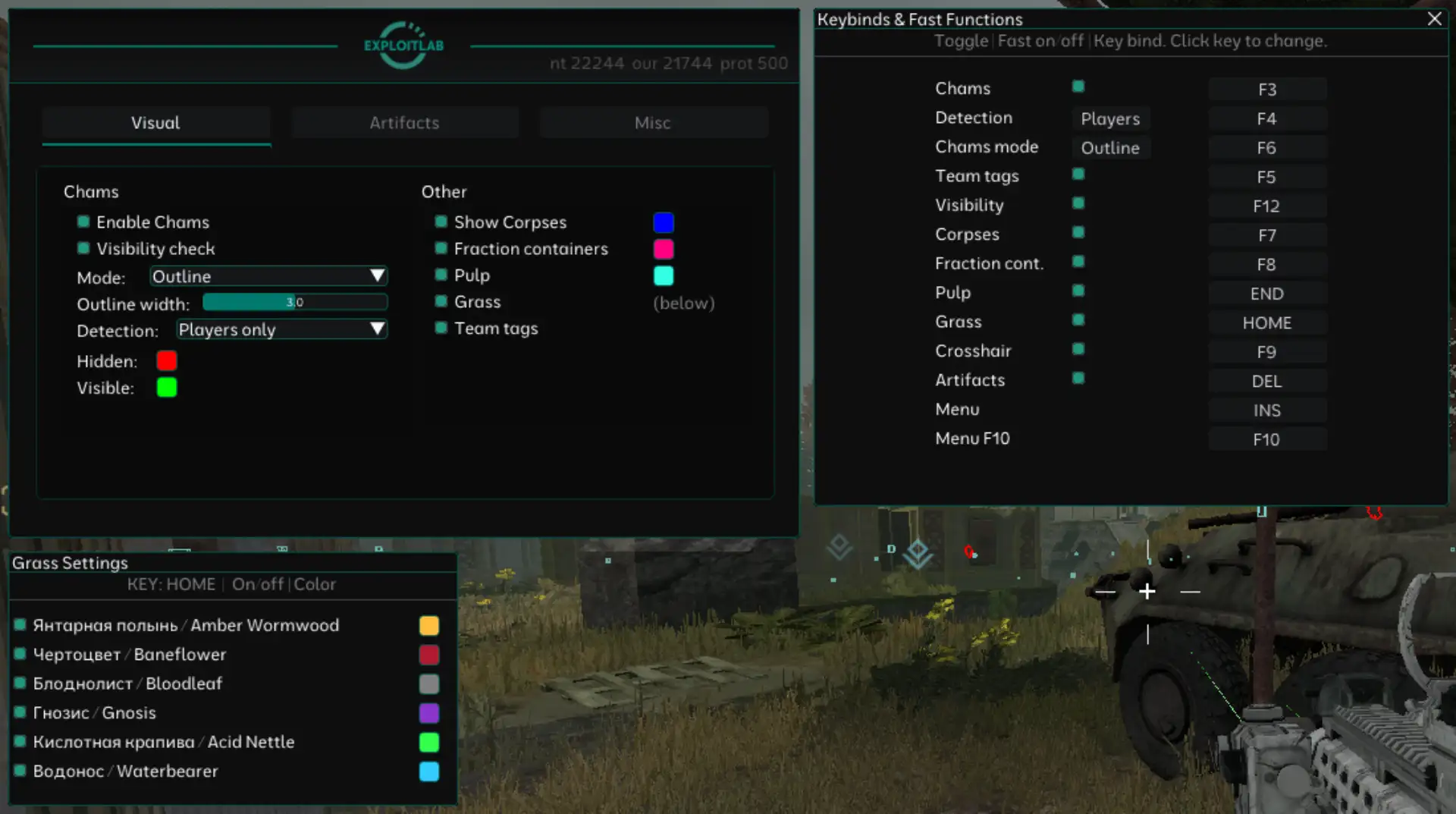 EXLAB Full is a premium cheat for STALCRAFT: X with a complete feature set. Chams highlights player models through walls with customizable colors. Team Tags display markers over friendly players. Corpses help locate bodies. Pulp shows pulp through all objects with boxes in three sizes (small, medium, large) with customizable colors at a range of up to 200 meters. Grass shows the locations of selected plants (Amber Wormwood, Devil Flower, Pale Leaf, Gnosis, Acid Nettle, Water Carrier) through all objects — each type is color-coded with adjustable settings through a separate window. Both modes make currency farming significantly easier. Visible Check changes highlight color on direct line of sight. Artifact ESP displays artifacts with visual boxes. Config Manager allows saving and loading settings. Screen Protector bypasses screenshots and OBS recording. Professional tool for STALCRAFT: X with extended capabilities. Includes many features to enhance gameplay and increase effectiveness in the Zone. Regular updates ensure compatibility with the latest game versions.
