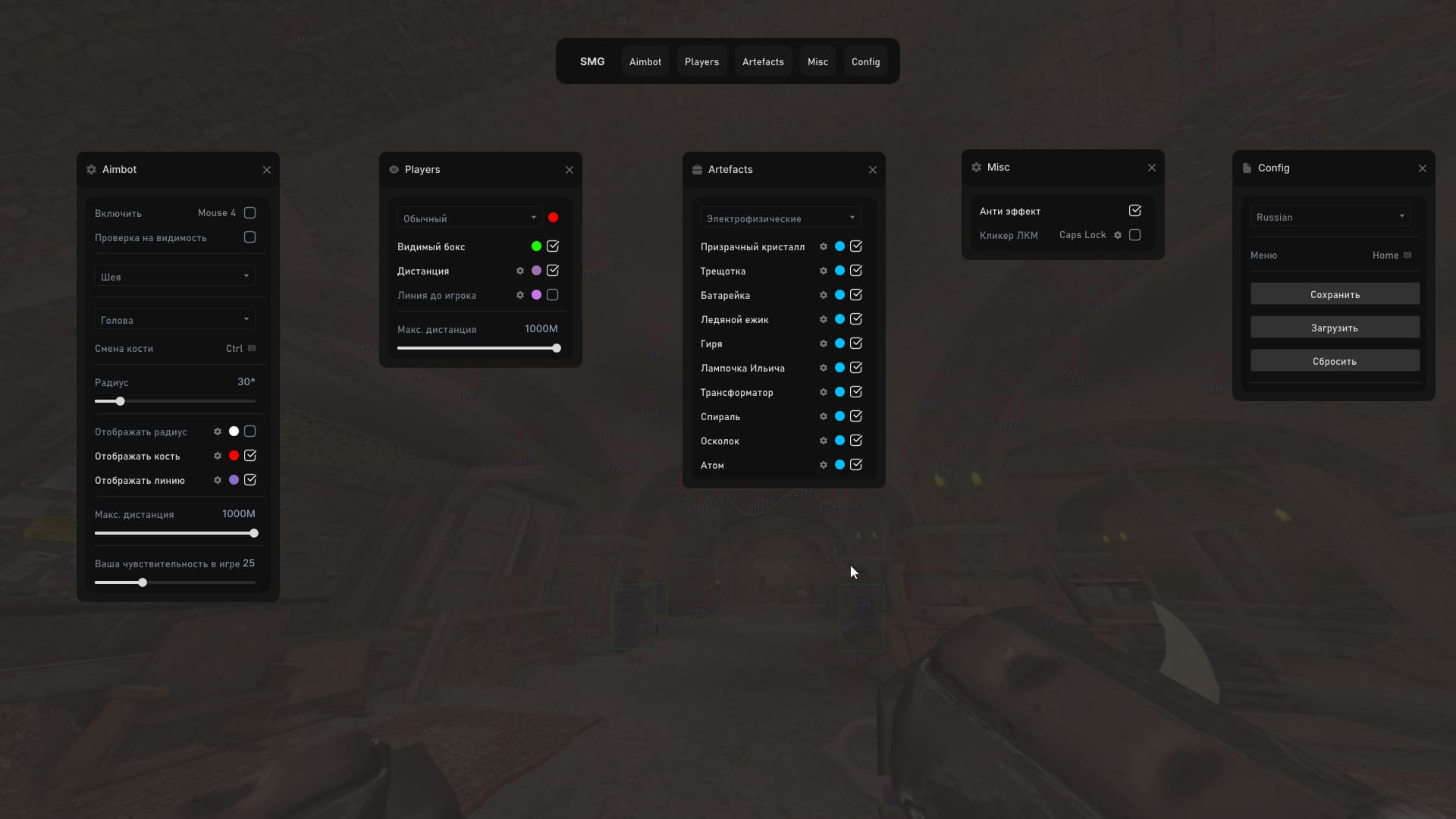 SMG — премиальный чит для STALCRAFT: X, объединяющий мощный аимбот с полным набором визуальных функций. Аимбот включает проверку видимости, гуманизацию для минимизации риска бана, выбор костей для прицеливания и настраиваемый радиус. Player ESP отображает игроков с настраиваемыми боксами, дистанцией и линиями. Artifact ESP поддерживает кастомный список артефактов с индивидуальными настройками цвета, имени и дистанции для каждого. Дополнительно: кликер ЛКМ, анти-эффект, анти-скриншот. Не виден на демках и в OBS/Discord. Профессиональный инструмент для STALCRAFT: X с расширенными возможностями. Включает в себя множество функций для улучшения игрового процесса и повышения эффективности в Зоне. Регулярные обновления обеспечивают совместимость с последними версиями игры.