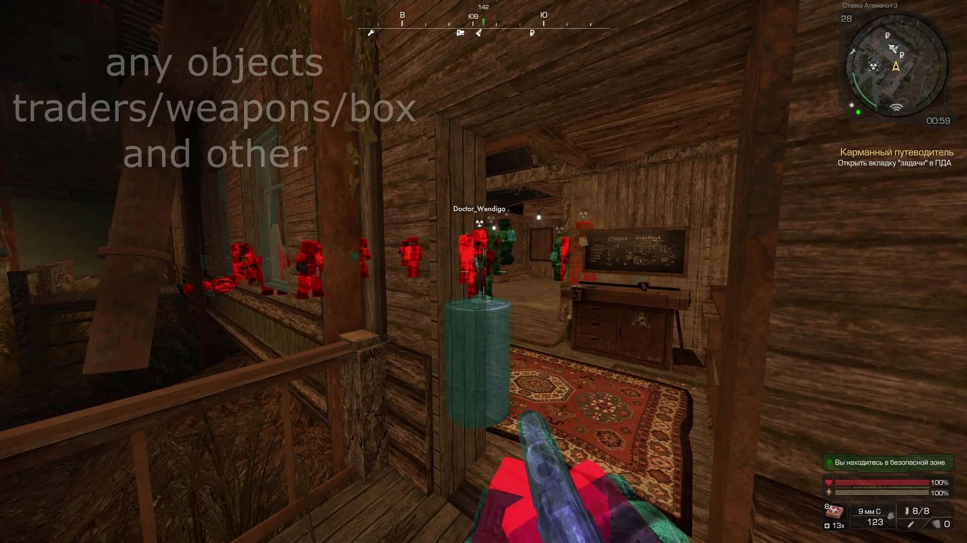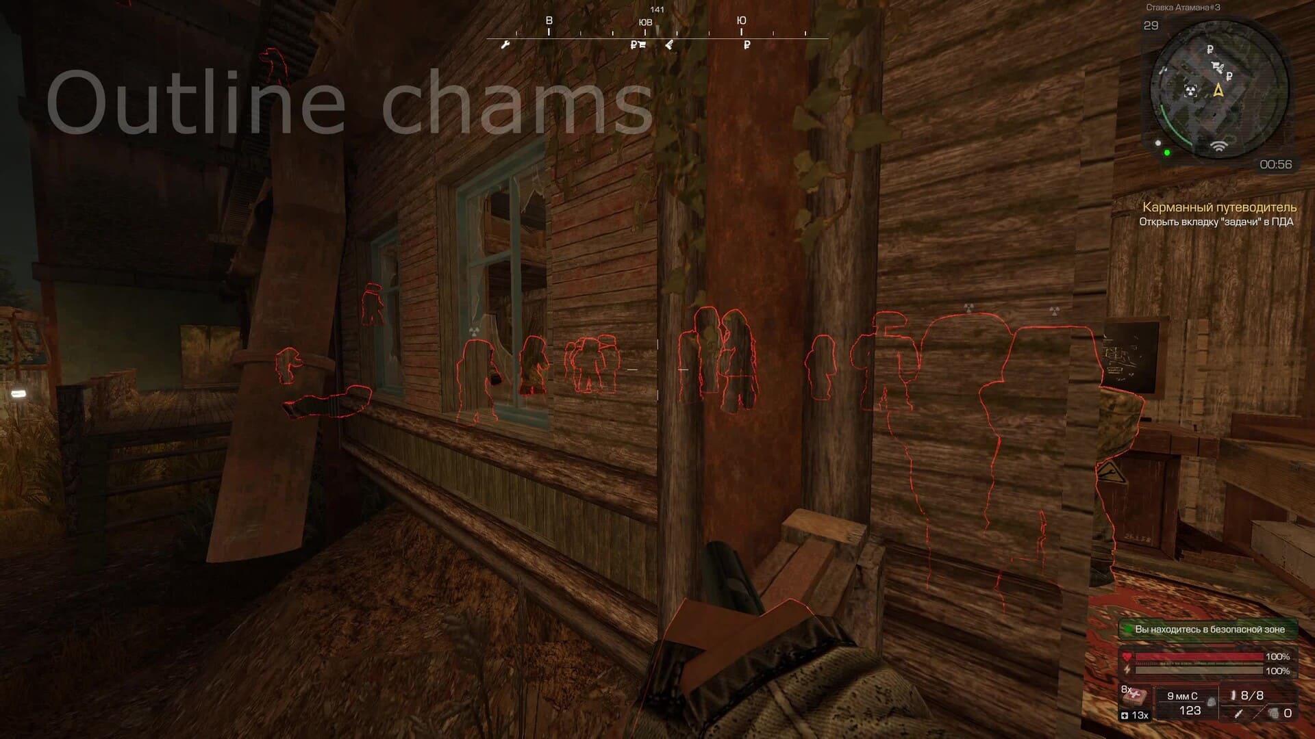 Чит с чамсами для STALCRAFT: X. Подсветка мобов и объектов разными типами чамсов — плоские, контурные, каркасные.